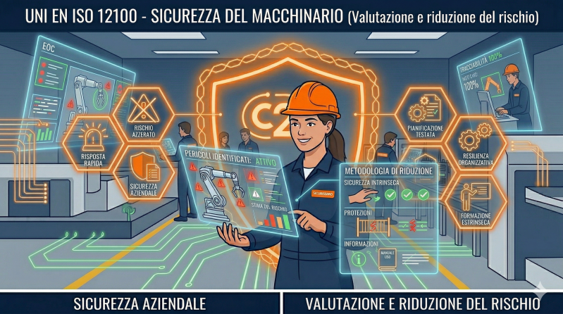 Specifica la terminologia fondamentale e la metodologia per la sicurezza del macchinario. Guida il progettista e l'utilizzatore nell'identificazione dei pericoli e nella stima dei rischi durante ogni fase del ciclo di vita della macchina (trasporto, montaggio, utilizzo, manutenzione, smaltimento). È la base della marcatura CE.
